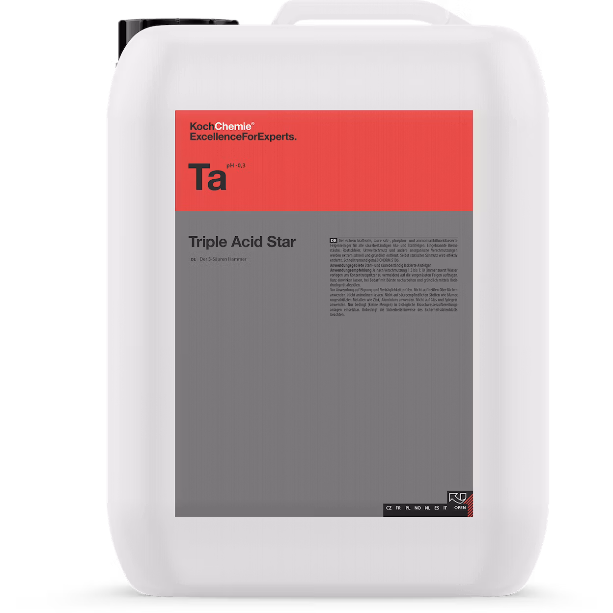Den ekstremt kraftige, sure, salt-, fosfor- og ammoniumbifluoridbaserte felgrenseren for alle syrebestandige aluminiums- og stålfelger. Innbrent bremsestøv, rustslør, miljøforurensing og annet uorganisk smuss fjernes ekstremt raskt og grundig. Selv statisk smuss fjernes effektivt.