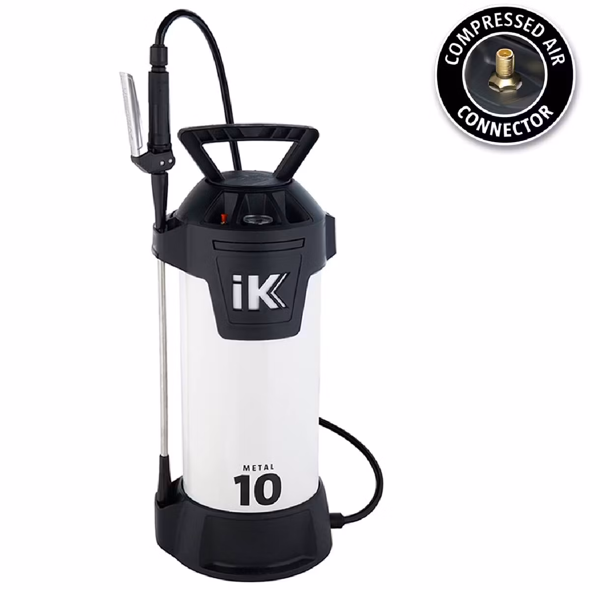 IK METAL 10 lavtrykkskanne er produsert i materialer med maksimal motstand for bruk med vegetabilske og animalske oljer, hydrokarbonbaserte løsemidler, smøremidler og petroleumsprodukter. Spesielt godt egnet til for eksempel petroleumsbasert avfetting, diesel, white sprit etc. IK METAL 10 er ideell for bruk i bilindustrien for oppgaver som bremserengjøring, fjerning av asfalt og tjæreflekker, fjerning av silikoner i oppgaver før lakkering av karosseri på kjøretøy etc. IK Metal 10 kommer som standard med ventil for kompressor men den kan også pumpes manuelt.
