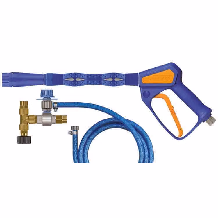 Pakke med injektor, skumlanse og tilførselsslange for kjemi. Du trenger slange mellom injektor og pistol i tillegg. Injektoren og T-stykket har M22 gjenger, mens pistolen har 3/8″ F gjenger.