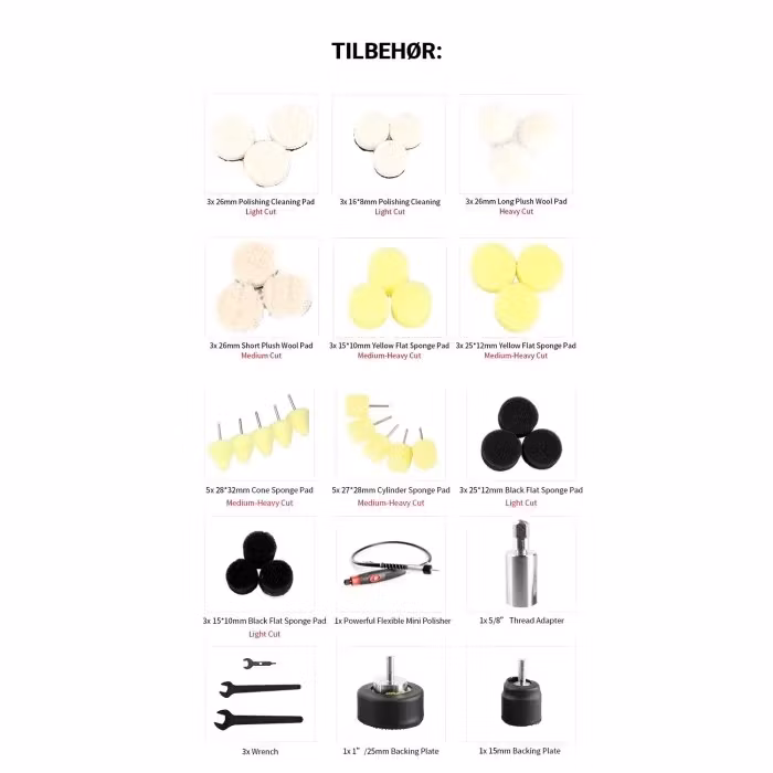 Spesialdesignet for å komme til rundt emblemer, lykter, bak dørhåndtak, riller i frontgrill, diverse interiøroverflater, og alle andre kriker og kroker som du ville hatt problemer med å komme til med en vanlig poleringsmaskin.